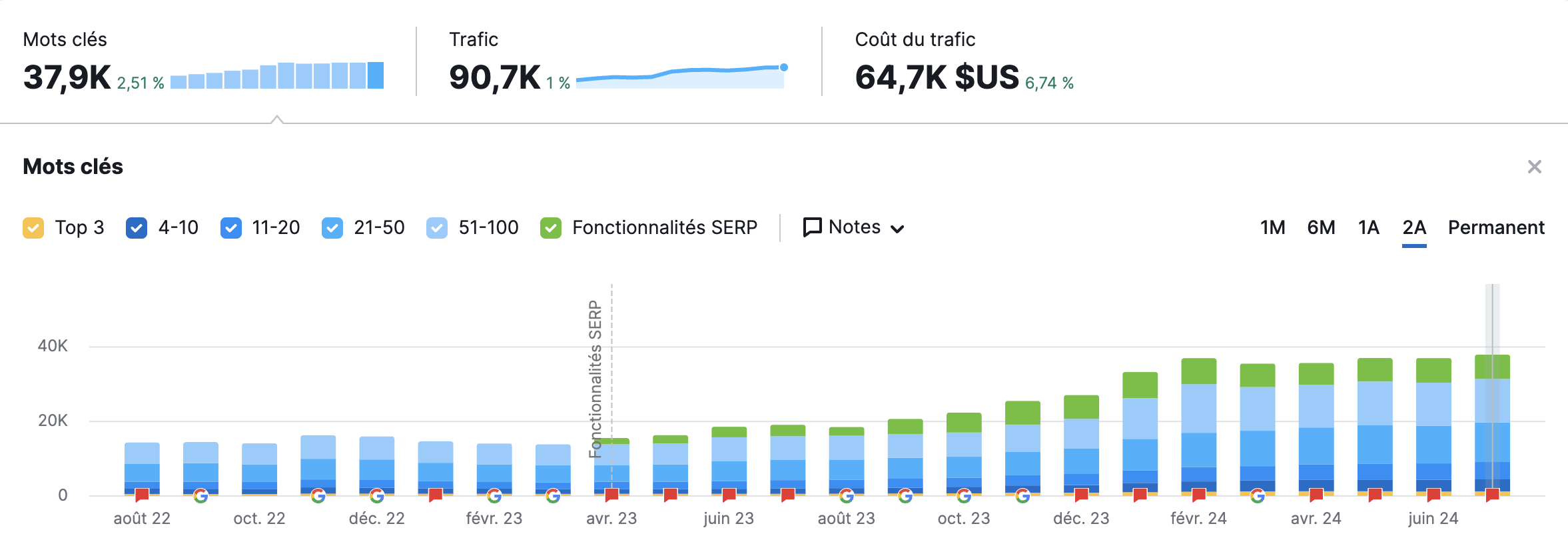 La marque est désormais recherchée 5 000 fois par mois, représentant 7% du trafic. Le SEO a permis de doubler le chiffre d’affaires, passant de 20% à 40% des revenus totaux de l’organisme. Grâce ces résultats, nous avons prouvé que le SEO peut être une source de croissance durable sans concentrer la majorité de l’acquisition, garantissant ainsi une stabilité pour l’entreprise.